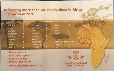 Two delightful, low-tech leaflets from RAM's office in midtown Manhattan, showing the breadth and frequency of the carrier's sub-Saharan connections, via Casablanca. With so few weekly services to most cities in West and Central Africa, these provide viable options, especially as they by-pass European hubs, and therefore can save time. Saturday, February 20, 2010
